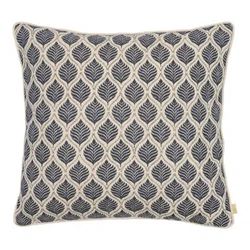 Denne smukke pude forener klassisk design med moderne tekstilhåndværk. Puden er dekoreret med et raffineret bladmotiv, hvor de fine, detaljerede blade træder smukt frem i en dyb marineblå nuance. Motivet udfolder sig elegant mod en blid cremefarvet baggrund og skaber en harmonisk kontrast med et roligt, sofistikeret udtryk.