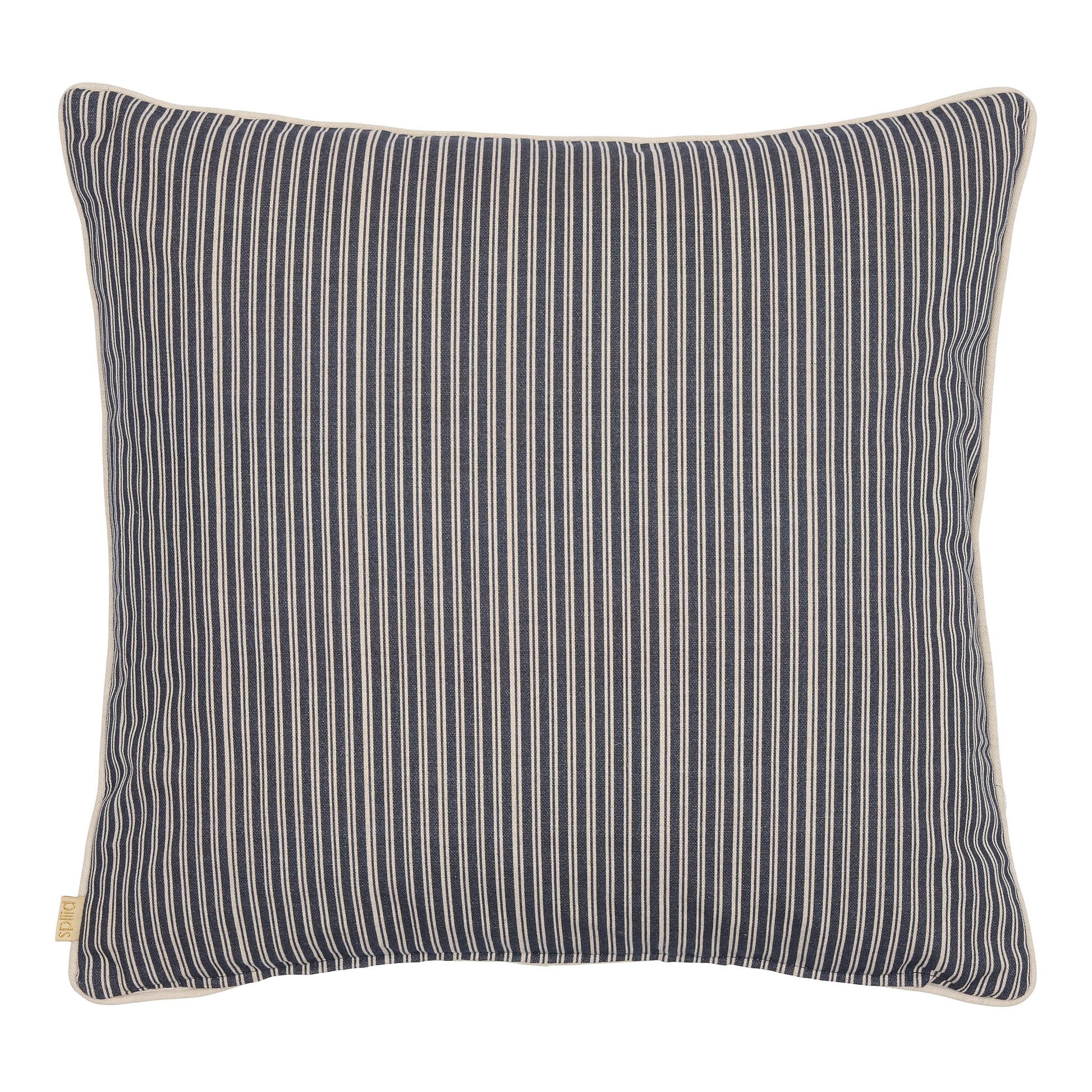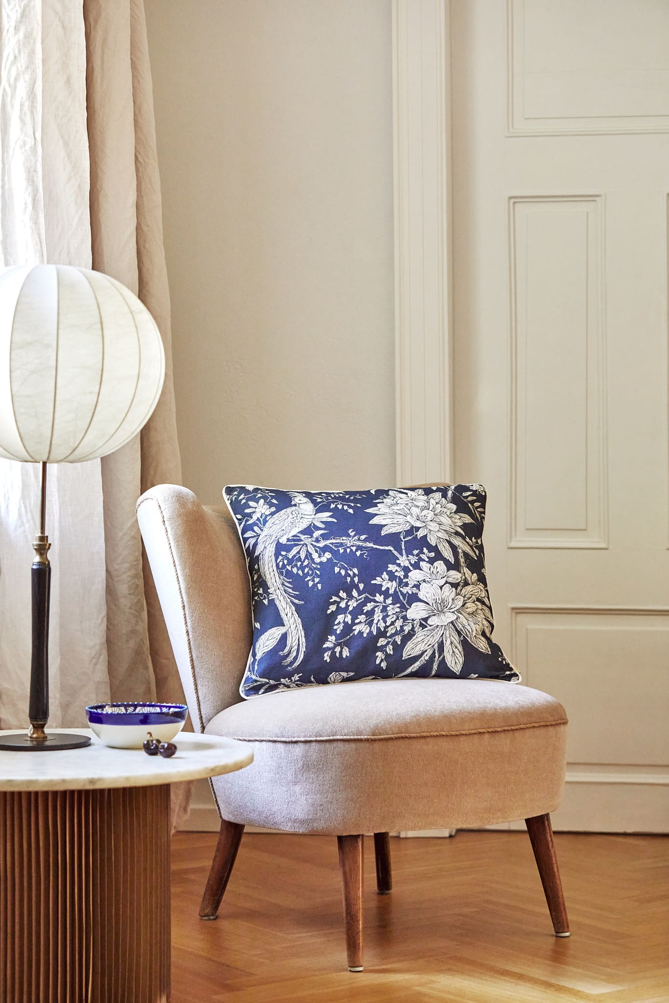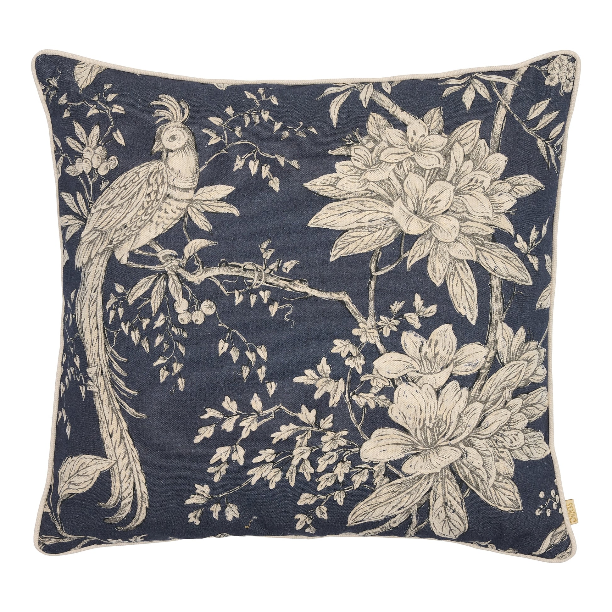 Smuk pude med et raffineret botanisk motiv med store blomster og yndefulde eksotiske fugle i sarte cremefarver mod en dyb, klassisk marineblå baggrund. Designet emmer af tidløs skønhed og tilfører et strejf af det eksotiske til enhver indretning. Den smalle kantsyning i beige indrammer designet smukt og fuldender det eksklusive helhedsindtryk.